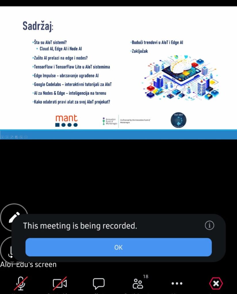 Specific goals include: development of a curriculum for informal education and training in the AIoT area, pilot implementation of the developed curriculum with the first generation of participants, development of AIoT Edu into a microcredential when the legal conditions are created, and provision of human resources for the potential development of this area in Montenegro. The AIoT Edu project is designed as a theoretical-practical course of informal education intended for high school students, students, technology professionals and anyone interested in this type of training.